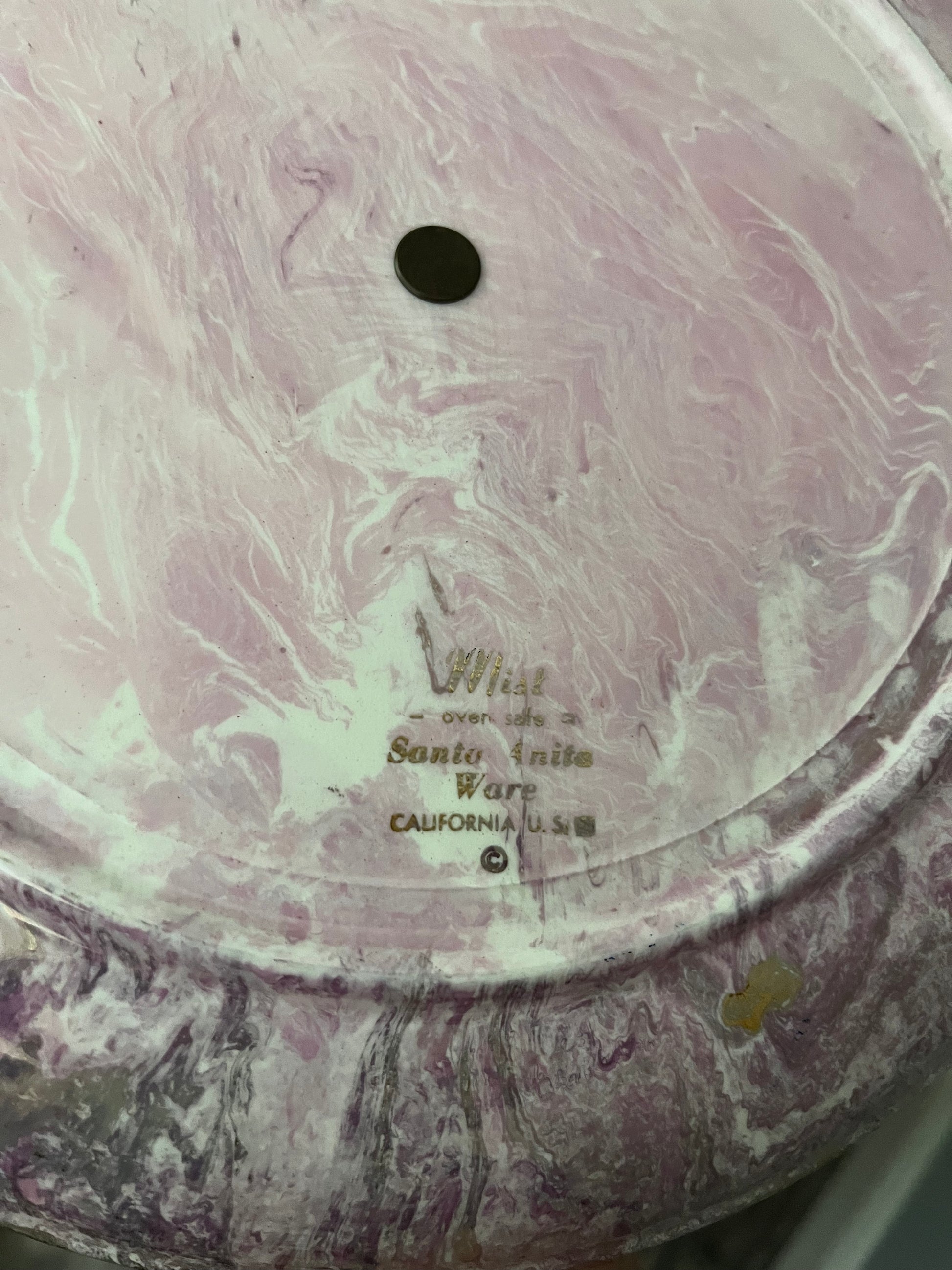 Invite a touch of vintage charm to your gatherings with this mid century two tier round serving tray by Santa Anita Ware, California. Featuring a striking pink mist pattern with swirling pink and gold designs and a goldtone handle, this tray is perfect for serving tidbits, appetizers, or desserts. The lower tray has a 10.5" diameter while the upper one measures 8.25" in diameter, giving it a total height of 9.5". The product is extremely rare and in excellent condition, making it a truly valuable find for any collector.