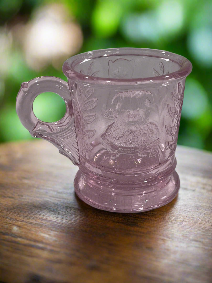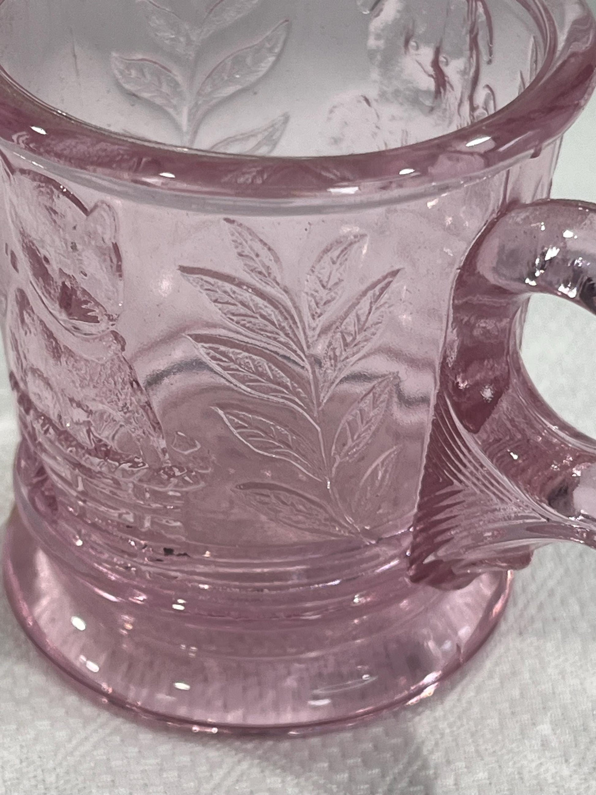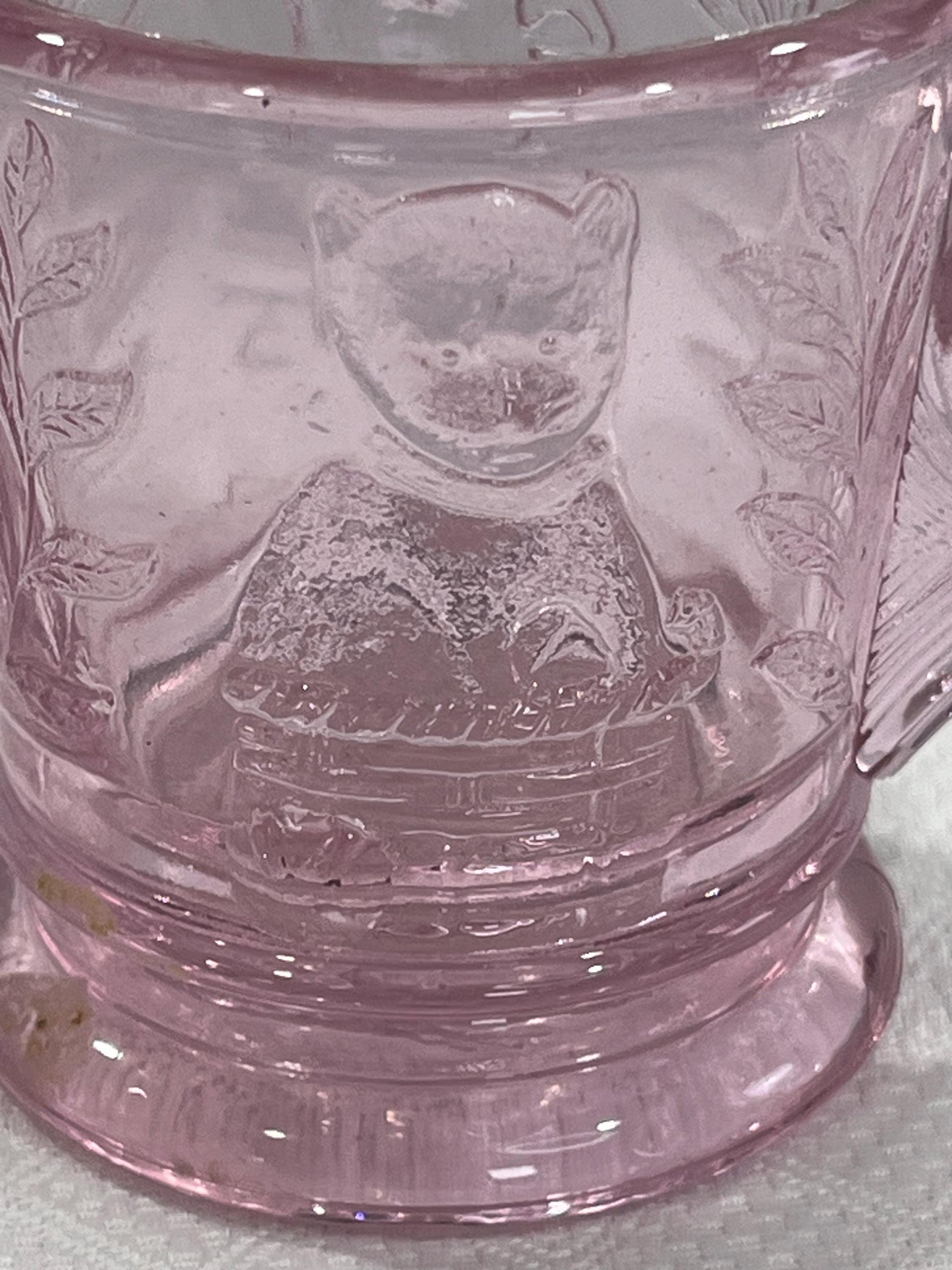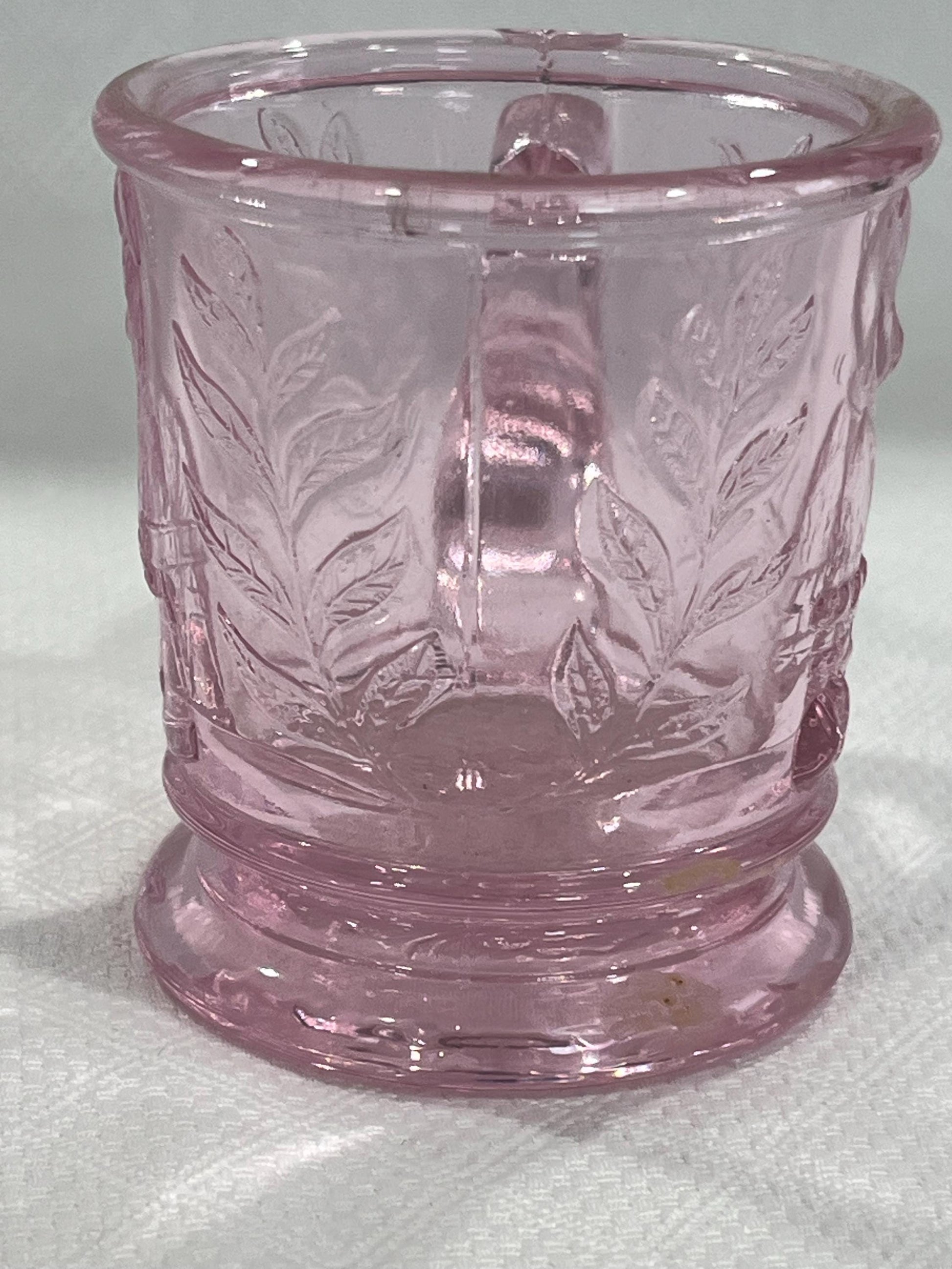 Present a special keepsake mug to a new child! This passion pink mug features embossed images of a cat in a basket, a bear on a drum, and leafy twigs. It is a quality piece crafted by the glass masters at Mosser in Cambridge, Ohio, and is part of the ABC Colonial Collection. 2.75" high x 2.5" across the rim. This mug will be cherished for a lifetime.