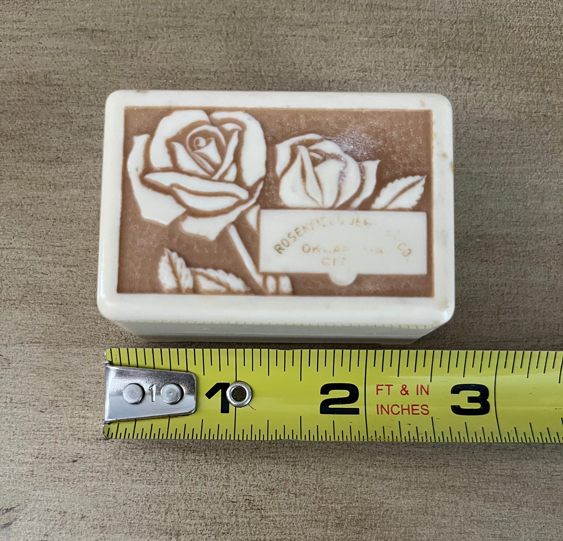 The box is made of celluloid or early acrylic. It's in good overall condition, with fading of the name on outer box lid. 2-6/16" long, 1.5" wide, 1-1/3" tall when closed. It does have a nick on the side of the early acrylic or celluloid box due to age.