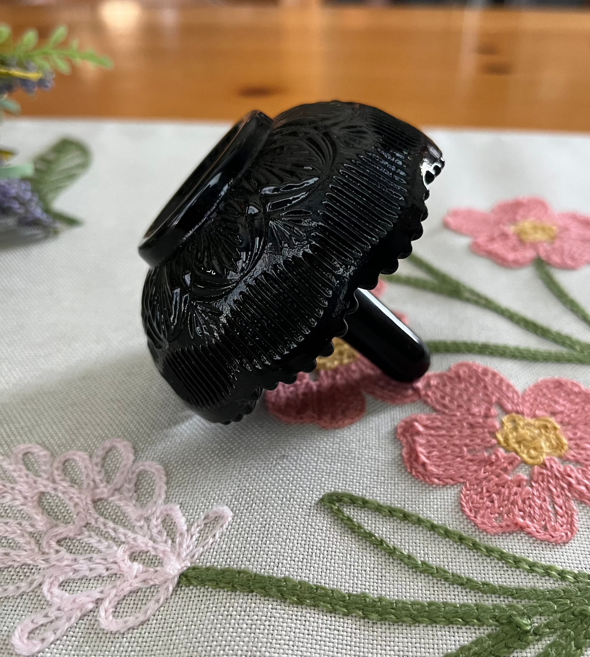 Never misplace your rings again with the chic and stylish Glossy Black Glass Ring Holder by Mosser Glass, USA. The lustrous black hue is incorporated into the entire piece and carefully crafted by hand. 3" tall and 3" diameter. Keep your rings safe and organized while adding a touch of glamour to your dressing table with this elegant accessory!