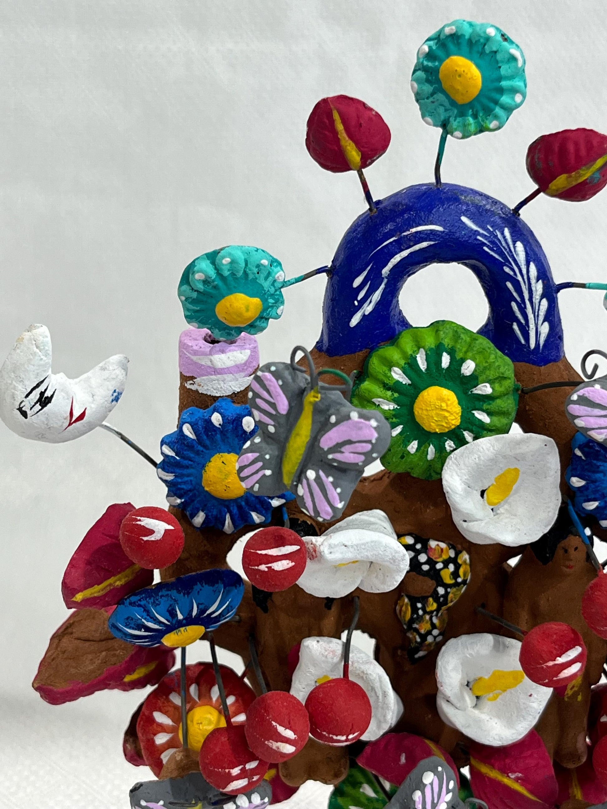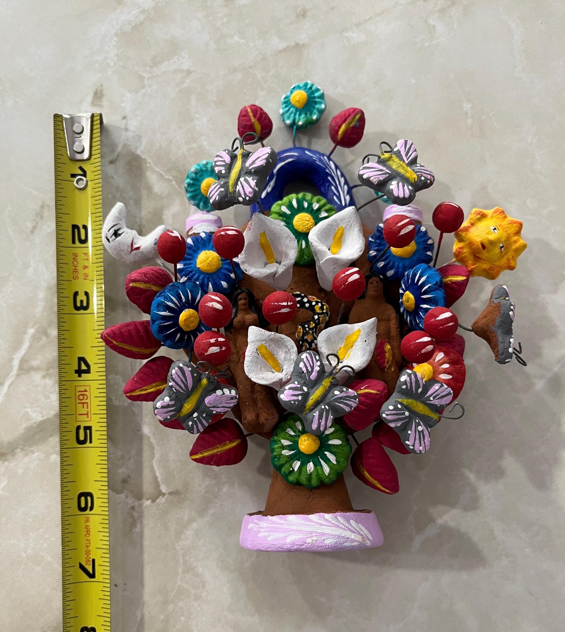 Enhance your decor with this stunning handmade clay Tree of Life, inspired by the biblical Book of Genesis. Crafted in Mexico, this piece showcases incredible detail, featuring Adam and Eve hidden among a sly serpent. High above, the beauty of the sun and moon shines down while the Garden of Eden is adorned with apples, exotic flowers and butterflies. Each piece is on a bendable wire, giving you the freedom to mold it to your liking. This unique artwork not only beautifies your space but also serves as a captivating conversation starter for friends and family. 6.75" tall x 6.5" long.