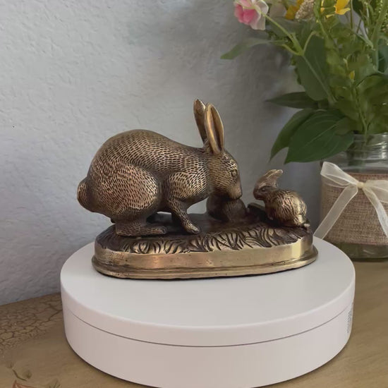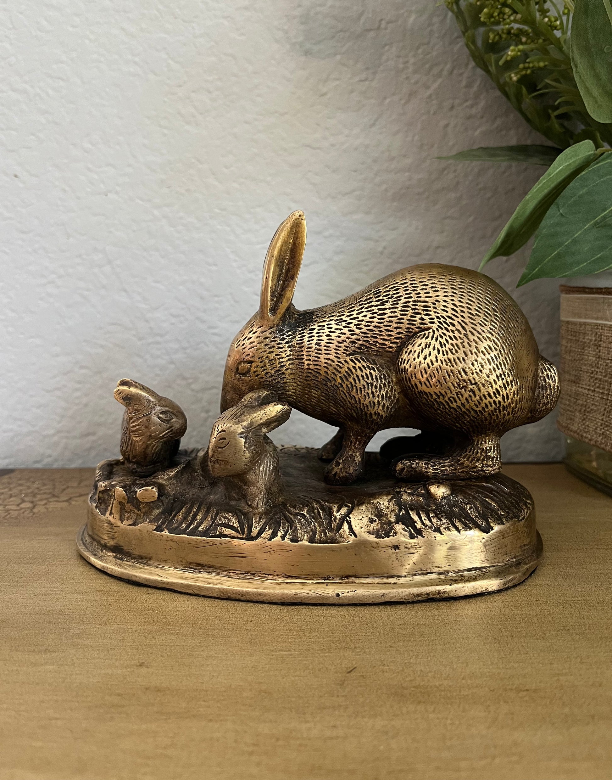 This intricately detailed brass statuette features a charming mother rabbit and babies, captured in their natural habitat of grass and flowers. The mother gently cares for her kits in this captivating depiction. Made in India, this vintage piece measures 6 inches in length, 4.5 inches in height, and weighs 3 pounds.