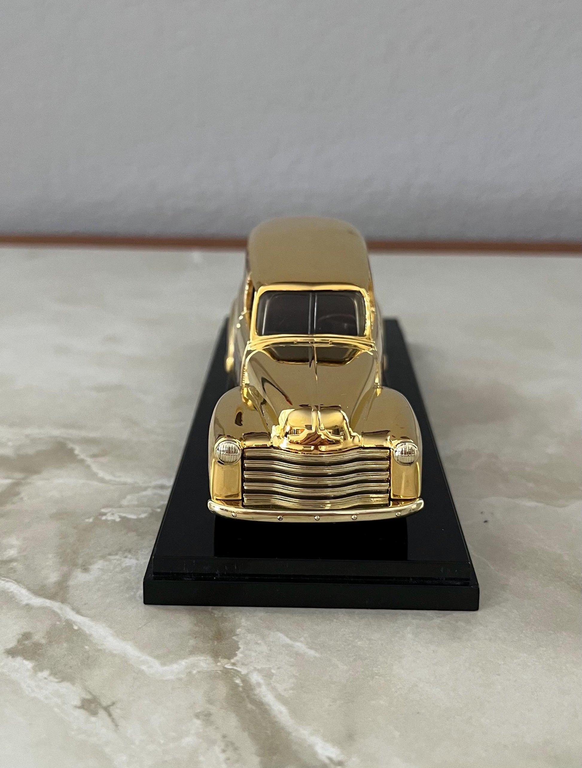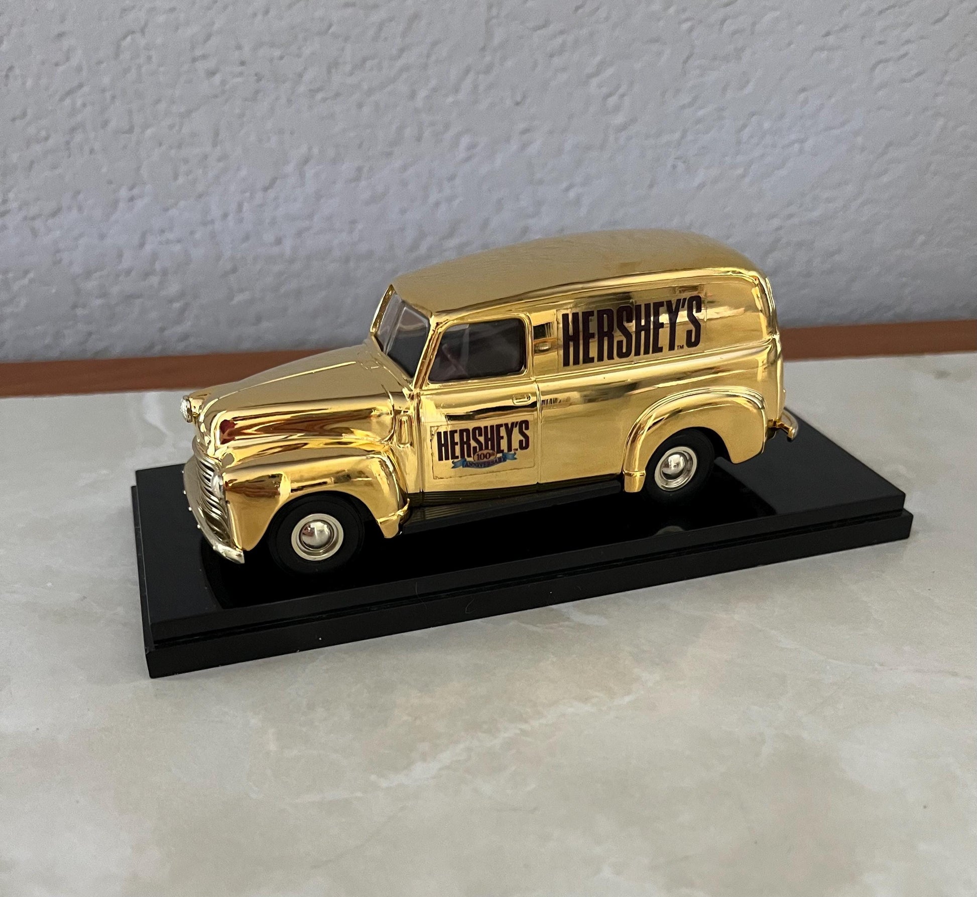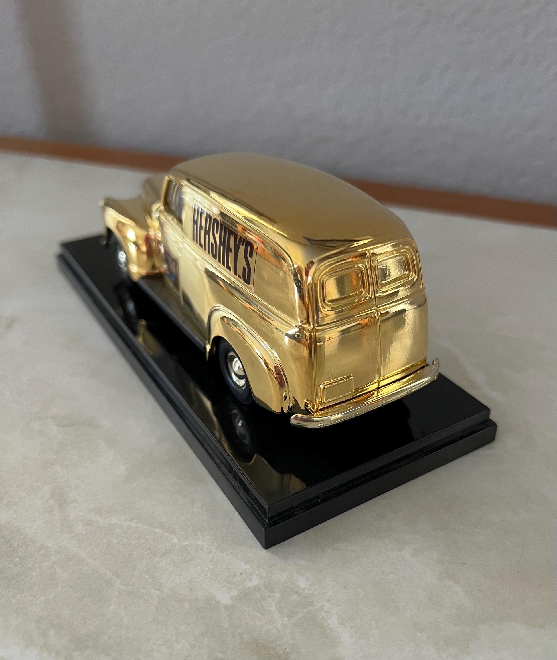 This collectible truck, celebrating Hershey's Chocolate 100th anniversary, is a must-have for collectors. It features a shiny goldtone panel with rolling wheels and comes with a display case. Measuring 4.5" long by 1.75" high and 1.25" wide, it would be a great addition to any study or bookcase. Whether you're a fan of classic cars or chocolate, this is a piece you won't want to miss.