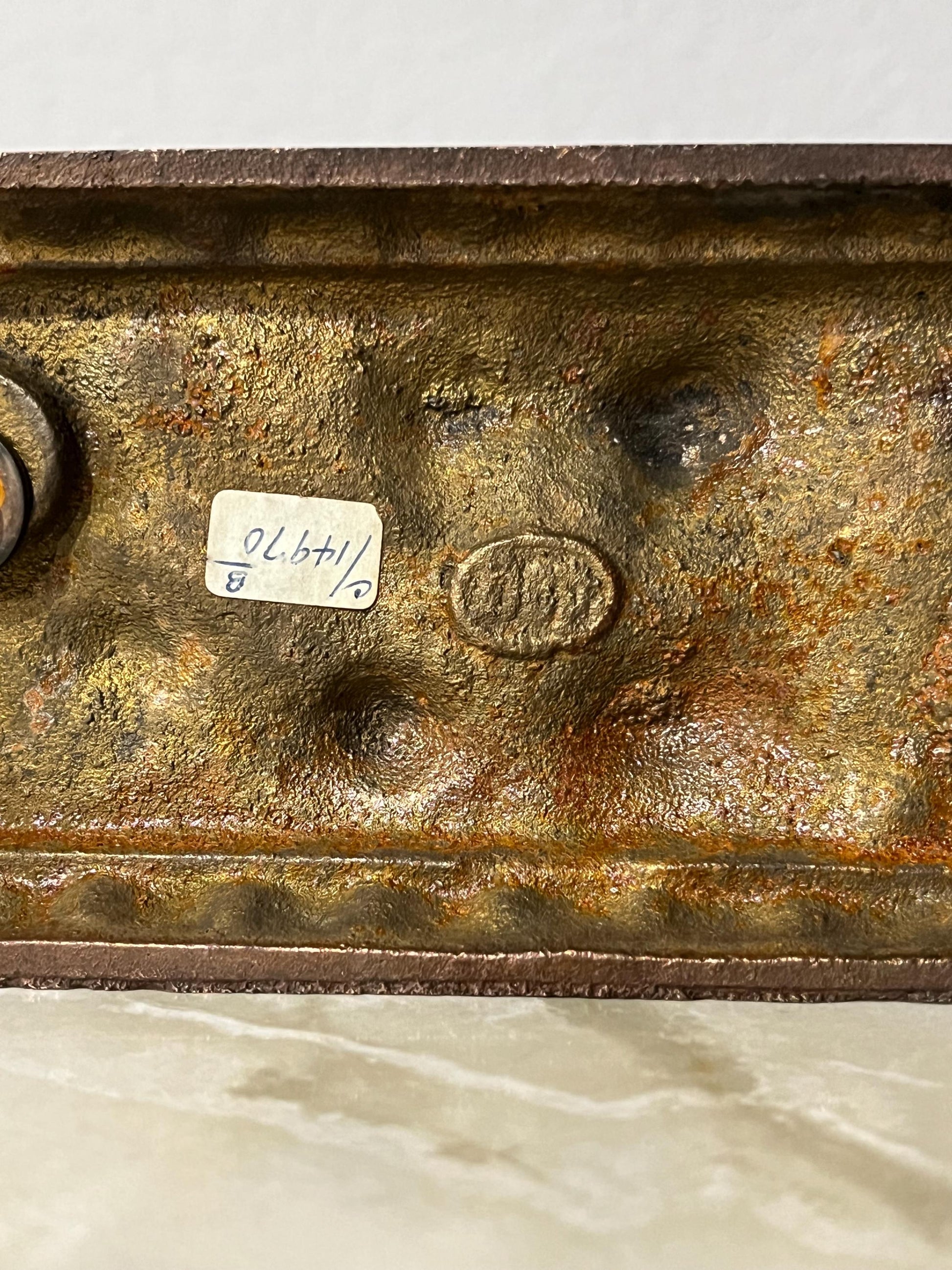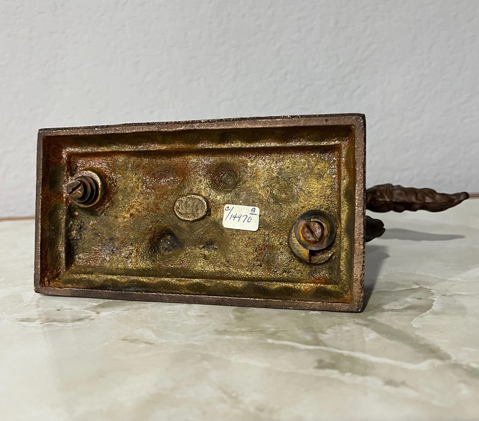 This heavy metal statue of a horse and trumpeter offers an aged copper finish and is stamped Dep on the underside with a number. Made in Germany in the early 1900s, it is constructed from 2 pieces that are screwed together and then mounted onto a base. Despite a crack in the lower part of the left rear leg, it remains a solid and sturdy piece. Standing at 7.5 inches tall, 7.5 inches long, and 2.5 inches wide, and weighing almost 4 pounds, this rare statue is sure to add a bold touch to any decor.