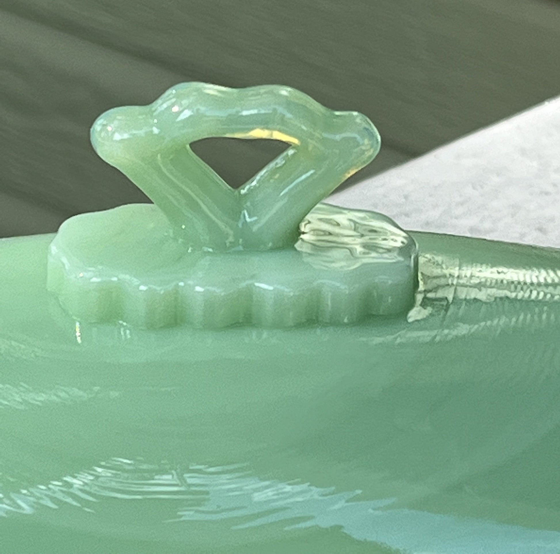 Crafted with care by renowned glass artisans at Mosser in Cambridge, Ohio. The beautiful jadeite hue runs through every inch of the glass, giving it a nostalgic touch to elevate your dining experience. Measuring at 8.75 inches long and 3.5 inches high, this butter dish is a classic addition to your table.