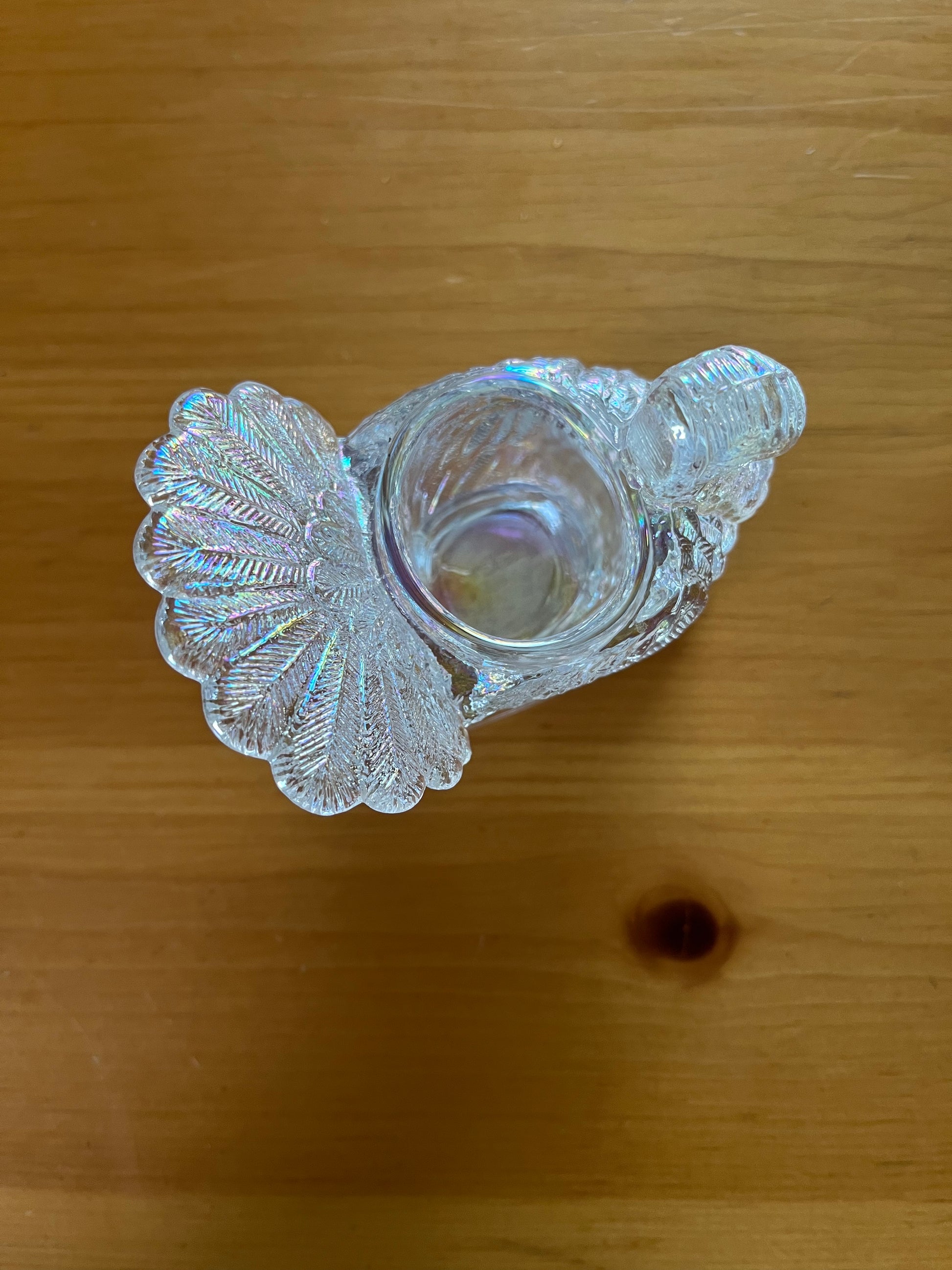 This beautiful crystal carnival glass toothpick holder adds charm to your dining experience and serves as a lovely kitchen decoration. The carnival hue is subtle, giving it a universal appeal. Handcrafted by renowned glass artisans at Mosser in Cambridge, Ohio, it's a delightful addition to your table and perfect for year-round use. 3.25" in height.