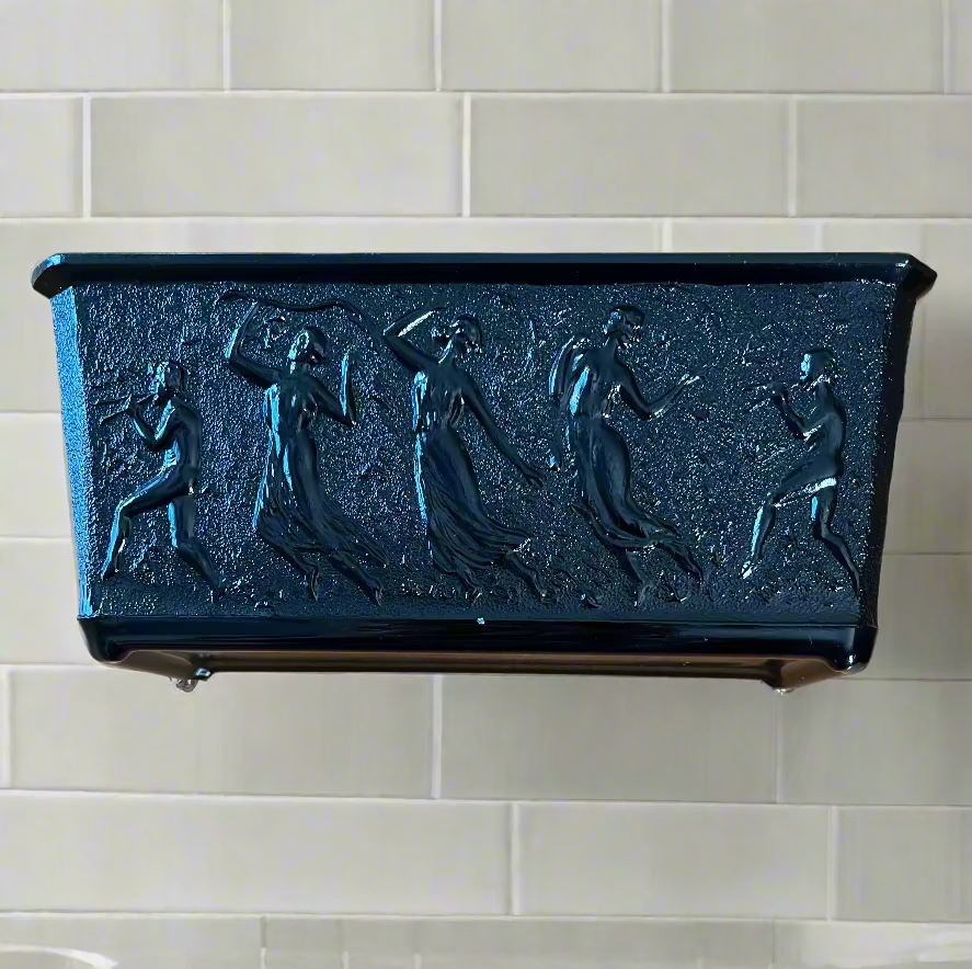 Crafted by the LE Smith Glass Company in the 1930s, this exquisite planter features an embossed design of women dancing to the melody of a flute player. Measuring 8" long, 3" wide, and 3.5" tall, it remains in excellent condition, making it a charming and timeless decorative piece.