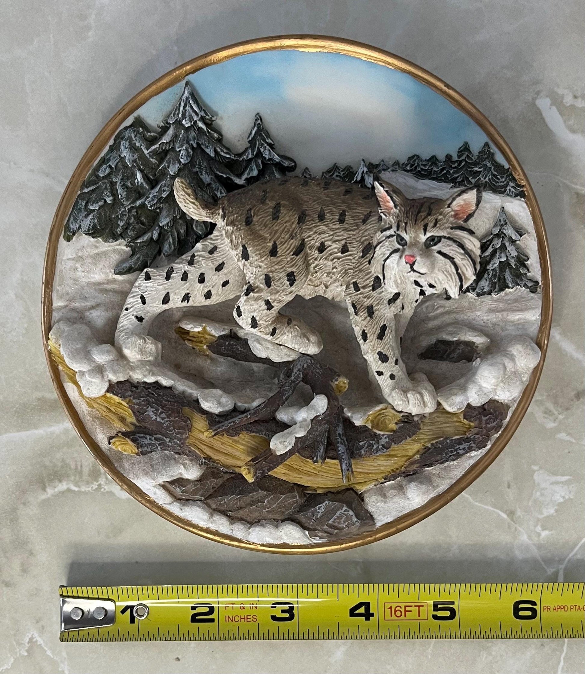 Beautiful 3D scene of a lynx in its natural habitat. Detailed features and glistening snow with dreamy soft clouds above. Gold colored rim. 6" across heavy ceramic. Plate holder not included. Excellent condition, makes a great gift for the collector or cat lover.