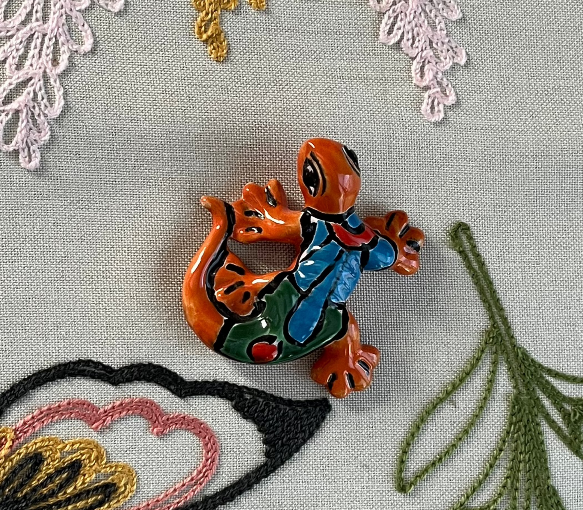 Charming mini ceramic Talavera salamander lizard. It features a convenient hole on the back, making it easy to hang wherever you like. With its cheerful smile, it’s sure to brighten your space. 2.5" long, 2.25" wide.