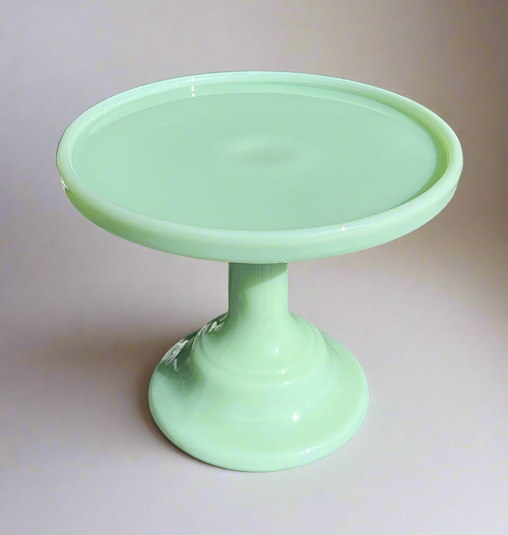 Elevate your dessert presentations with the exquisite jadeite green glass 6-Inch Cake Stand. The color is moulded throughout the glass not just the surface. Its classic design and delicate hue make it the perfect centerpiece to showcase your baked goods in style. 6" diameter, 5.5" high. Made by glass artisans at Mosser Glass in Cambridge, Ohio.