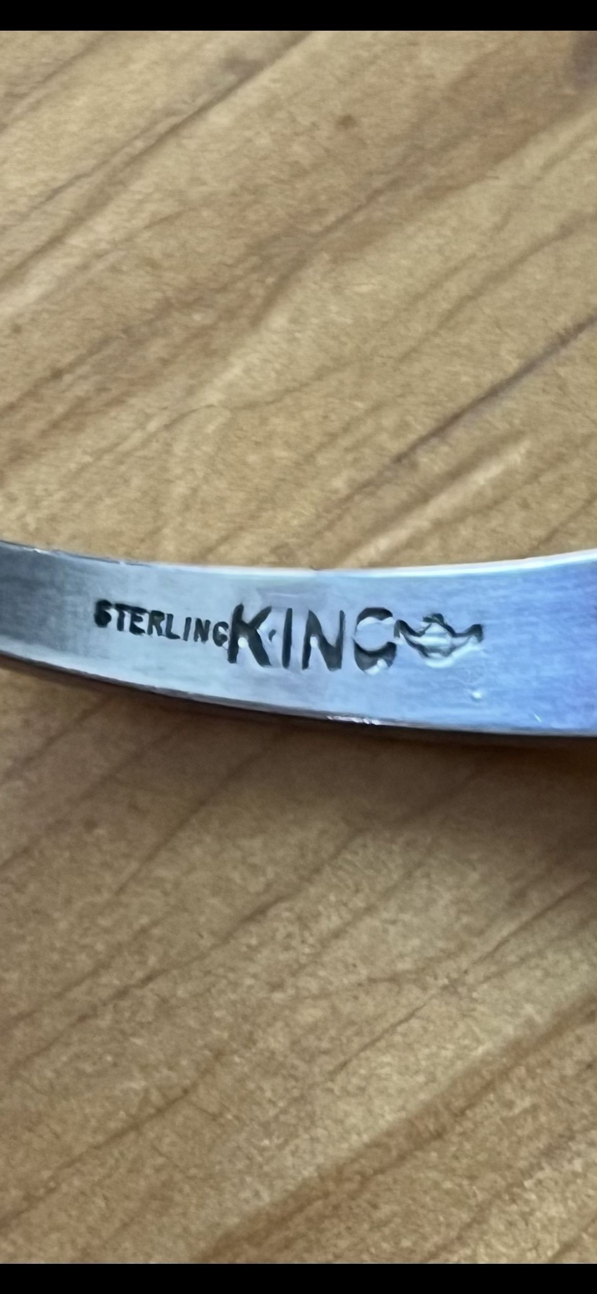 Experience the charm of this sterling silver and coral bracelet, skillfully hand crafted in a serene minimalist design. The smooth oval coral stone, measuring 1/2" x 1/4" x .25", adds a touch of nature's beauty to this timeless accessory. Made by Navajo Native American artist Ray King, this bracelet is truly a unique work of art. Don't miss your chance to own this incredible piece, backstamped for authenticity.