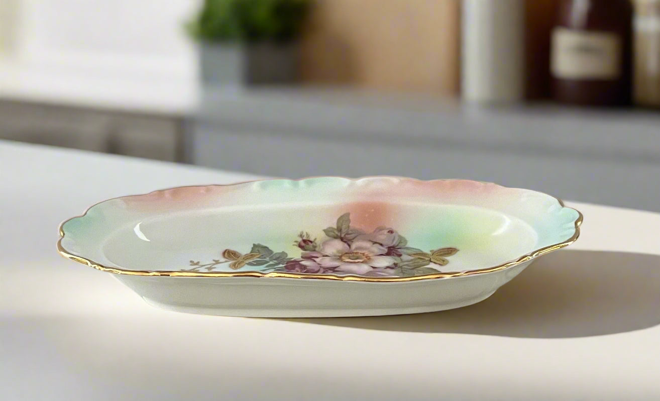 Add a pop of Spring to your table with this lovely vintage relish dish. Decorated with delicate pastel flowers and accented with gold, it measures 9.5" x 5.5" x 1.25" and is in excellent condition. A perfect addition for serving sushi, canapes, and more.