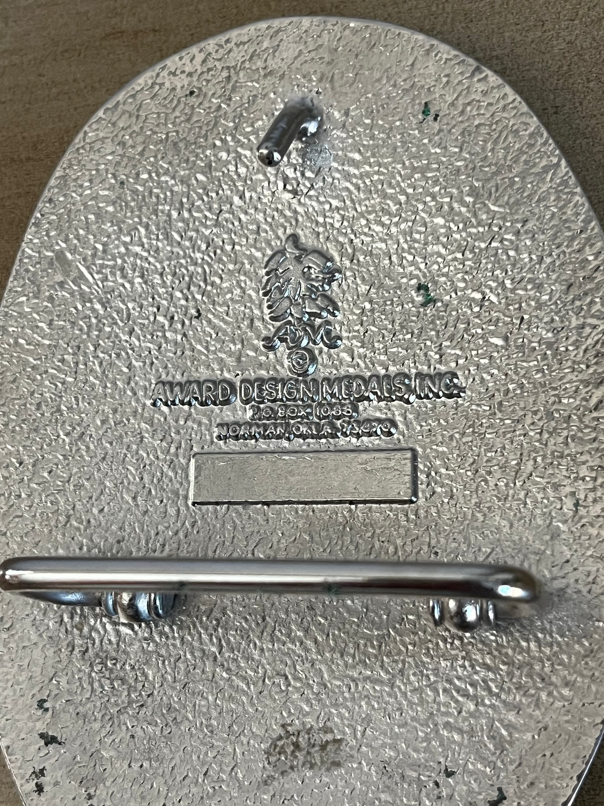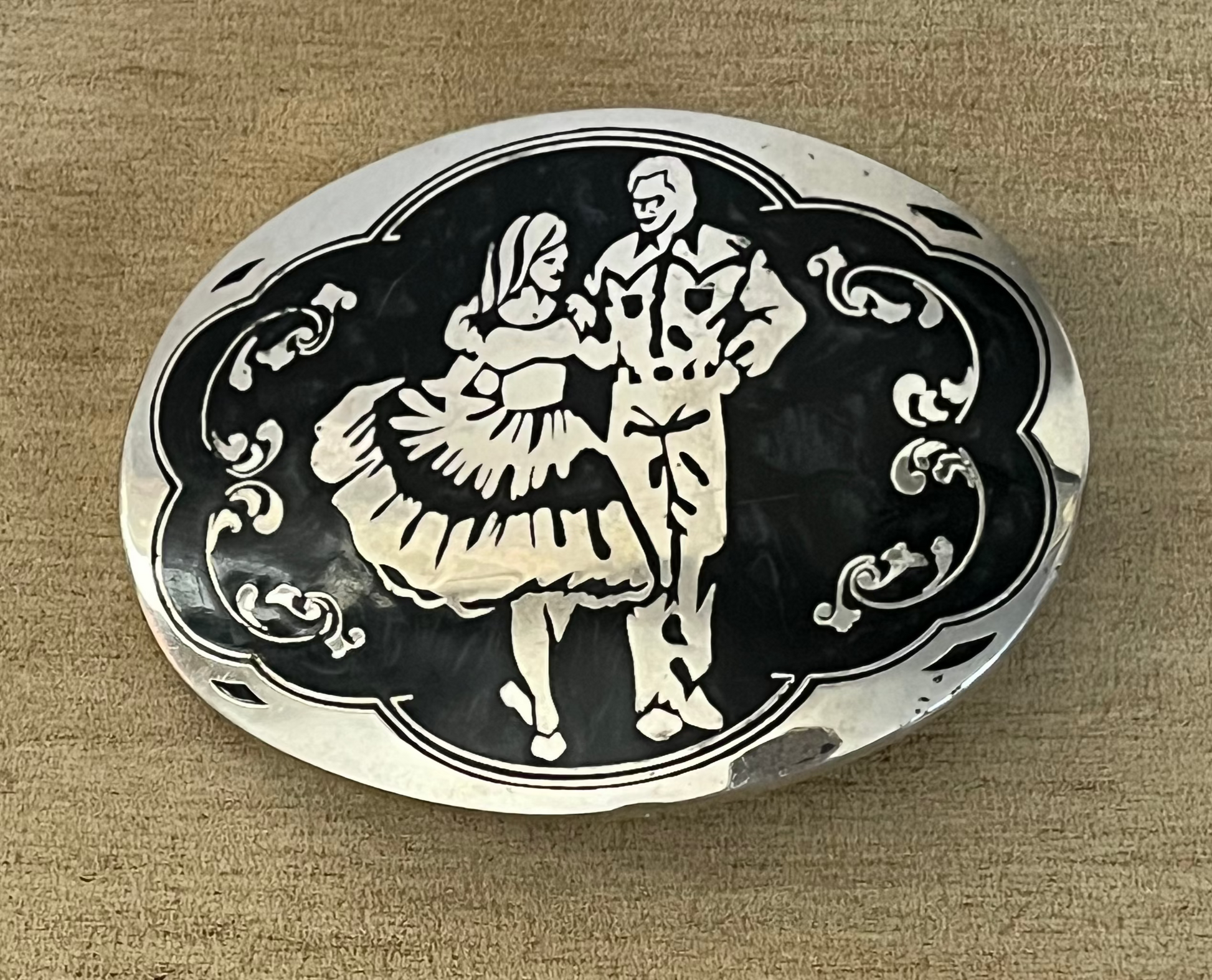 Capture the spirit with this oval belt buckle featuring a charming square dancing couple. Hand crafted in silver chrome with a mottled black finish by Award Design Medals of Norman, Oklahoma. While the back shows minor wear, the front remains in excellent condition. It's a timeless treasure from a well respected company now gone. Make it part of your collection and heritage today.