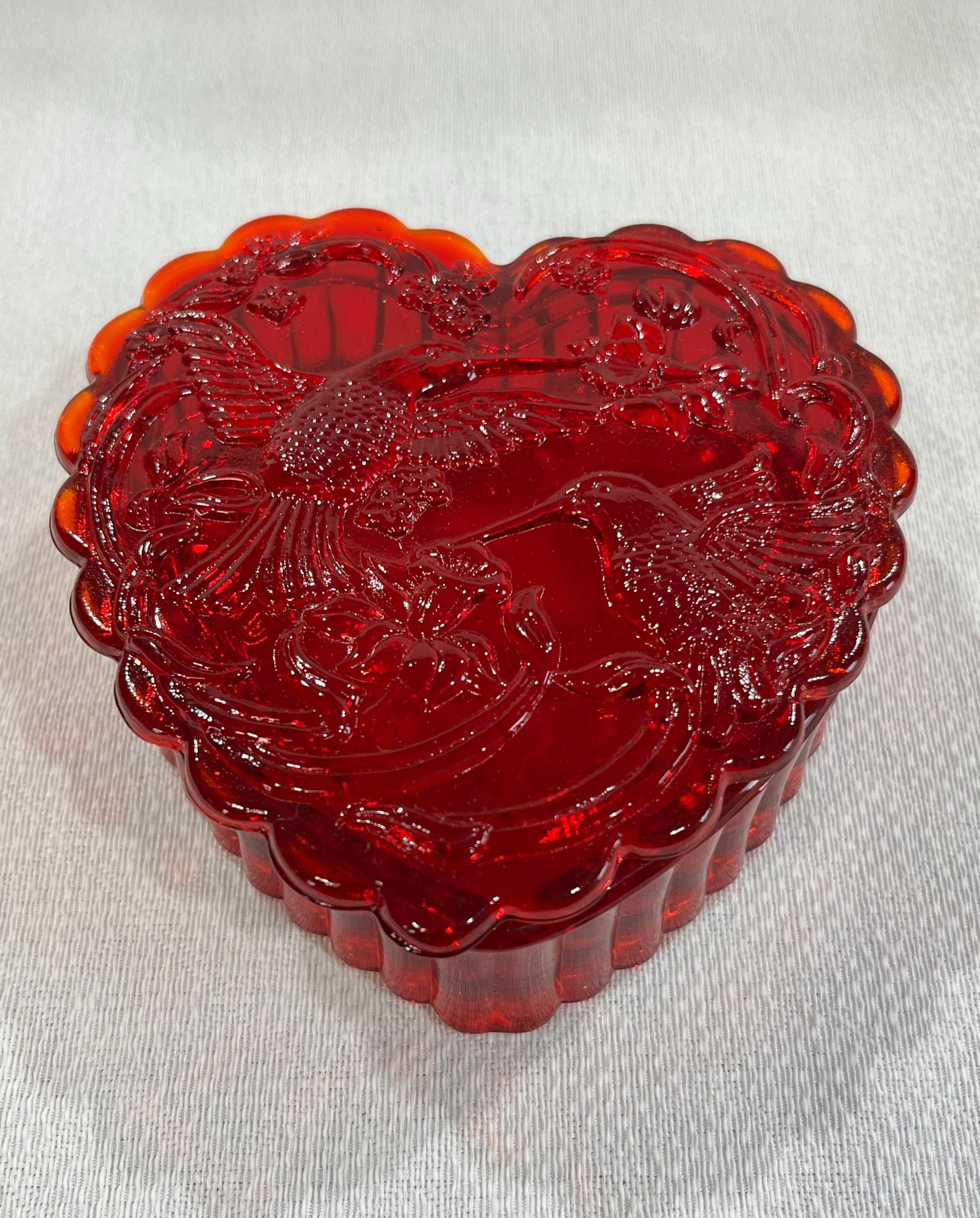 Large Ruby Red Glass Heart Box with Hummingbird and Flowers