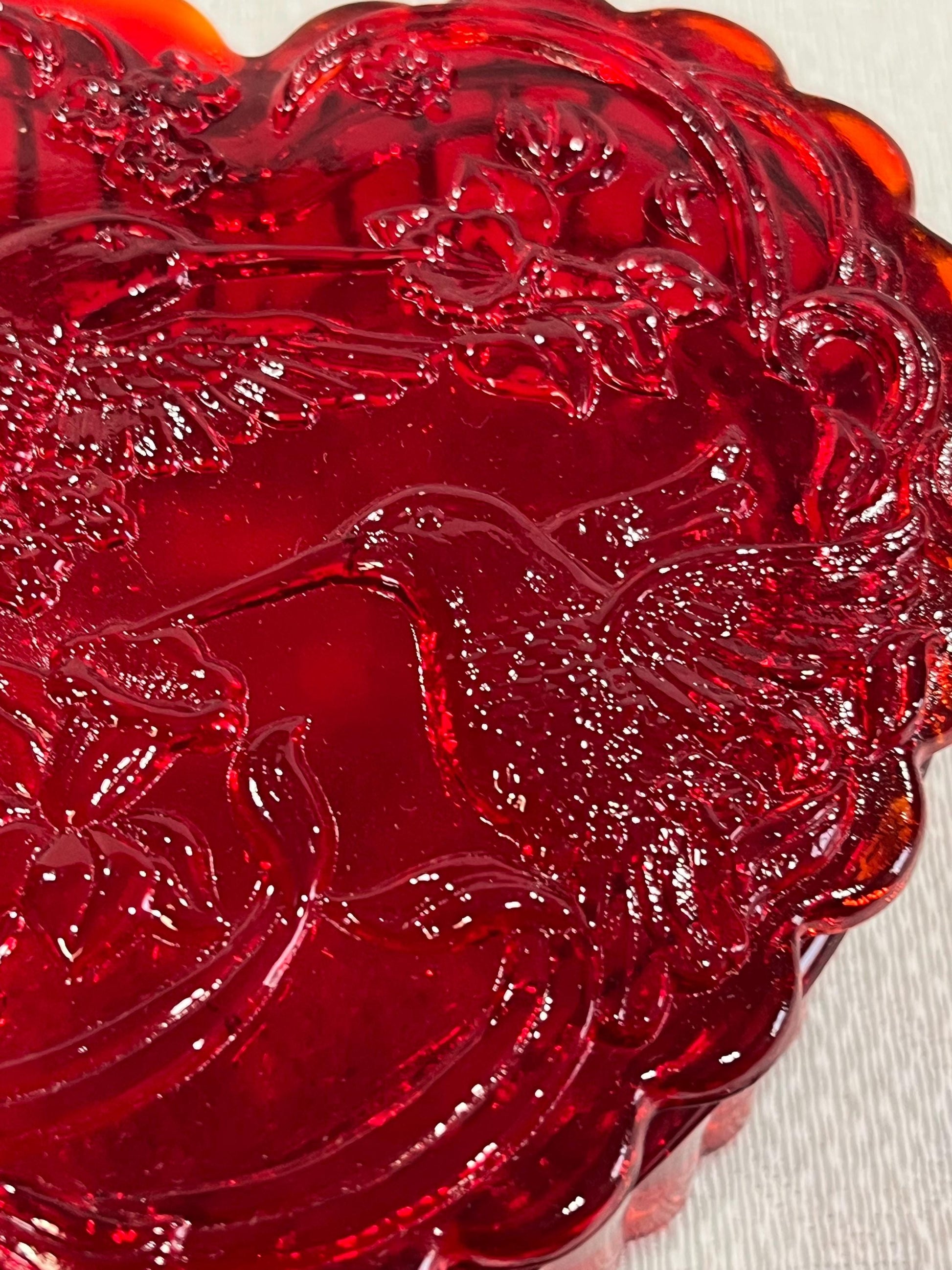 Large ruby red glass heart shaped box! Elaborately detailed with embossed flowers and a hummingbird. Masterfully crafted by the renowned artisans at Mosser in Cambridge, Ohio. Use it for trinkets, jewelry, treats and more. This delicate box not only serves as a perfect keepsake but also sets the stage for a truly memorable gift. 4" x 1.5", 12 ounces.