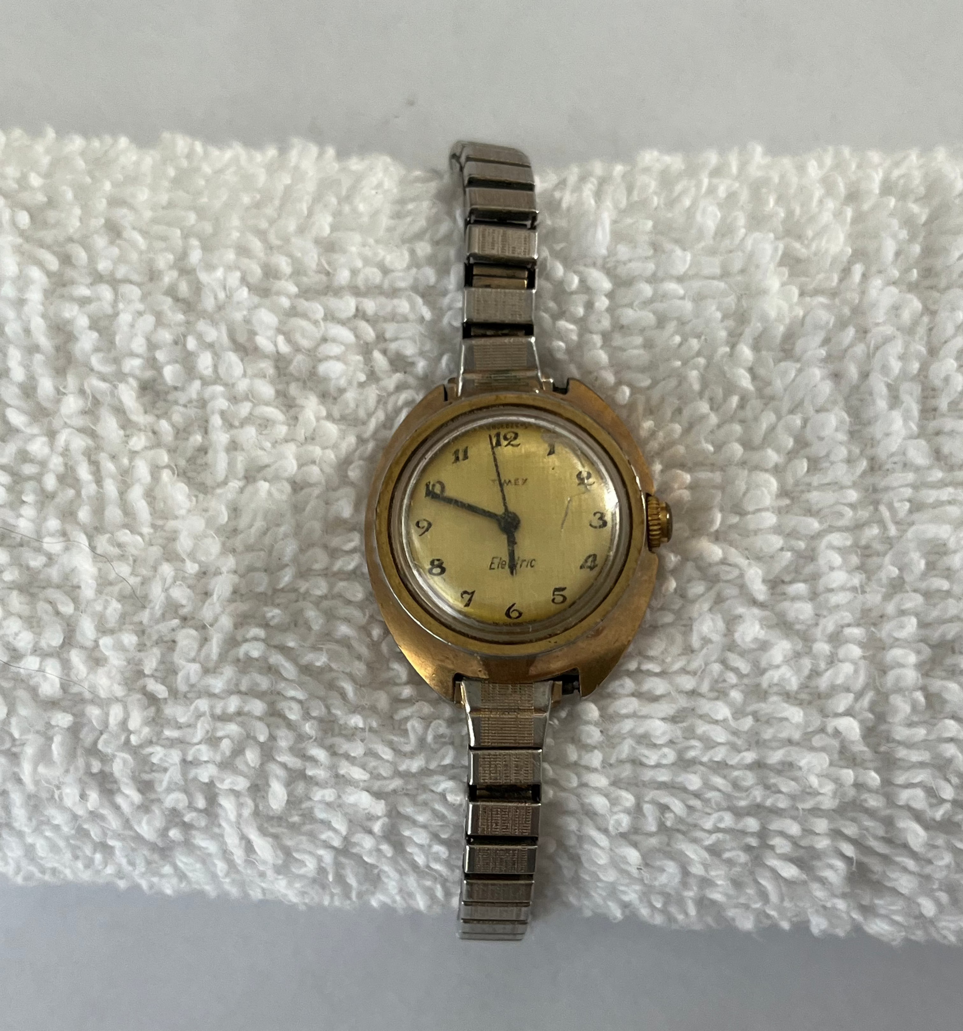 Capture the spirit of the 1970s with this vintage Timex Electric Dynabeat wristwatch. Featuring a gold-tone case and silver-colored expandable band, it’s a stylish nod to a bygone era. Presently not running and may require a new battery, Small scratch on face. Dainty 3/4" diameter, this watch has a klunky funky 70's appeal.