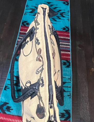 Perfect for a wild west night out on the town. Add a touch of ranchwear to your outfit—there's plenty of storage for all your necessities. This quality piece features a nice interior lining. No pockets. Zip closure. Durable rolled handles. Made from thick cotton. Foldable and packable. 13" long x 11" high x 6" wide.
